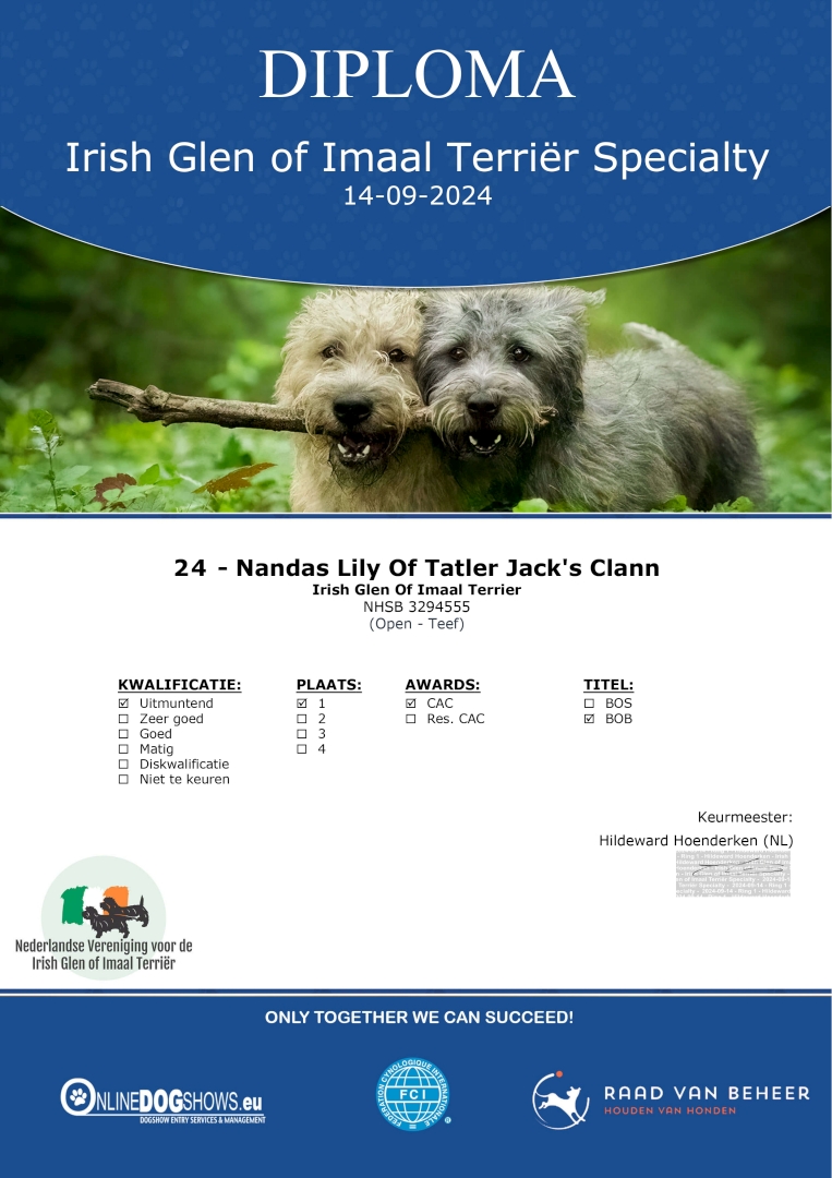 Vandaag heb ik vol trots mogen vernemen van de eigenaresse, van haar hond Lily, een Irish Glen of Imaal Terriër, dat zij clubkampioen 2024 is geworden. Lily liep deze dag mee in de open klasse en kreeg een 1e uitmuntend. Later moest Lily lopen voor de verkiezing van Beste Teef. Toen alle teven gekeurd waren in de diverse klassen en alle nr 1 met Uitmuntend, tegen elkaar moesten lopen, voor beste teef, werd Lily gekozen: Beste Teef.